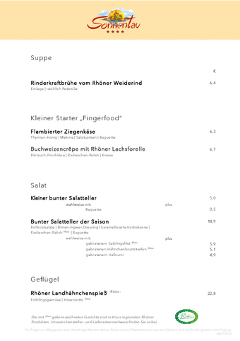Zusätzlich zu unserer Regulären Speisekarte bieten wir noch eine täglich wechselnde Tagesempfehlungskarte an wie z.B. eine Osterkarte mit Lamm, Pfifferling- oder Spargelgerichte sowie auch Wildgerichte und saisonale Braten.